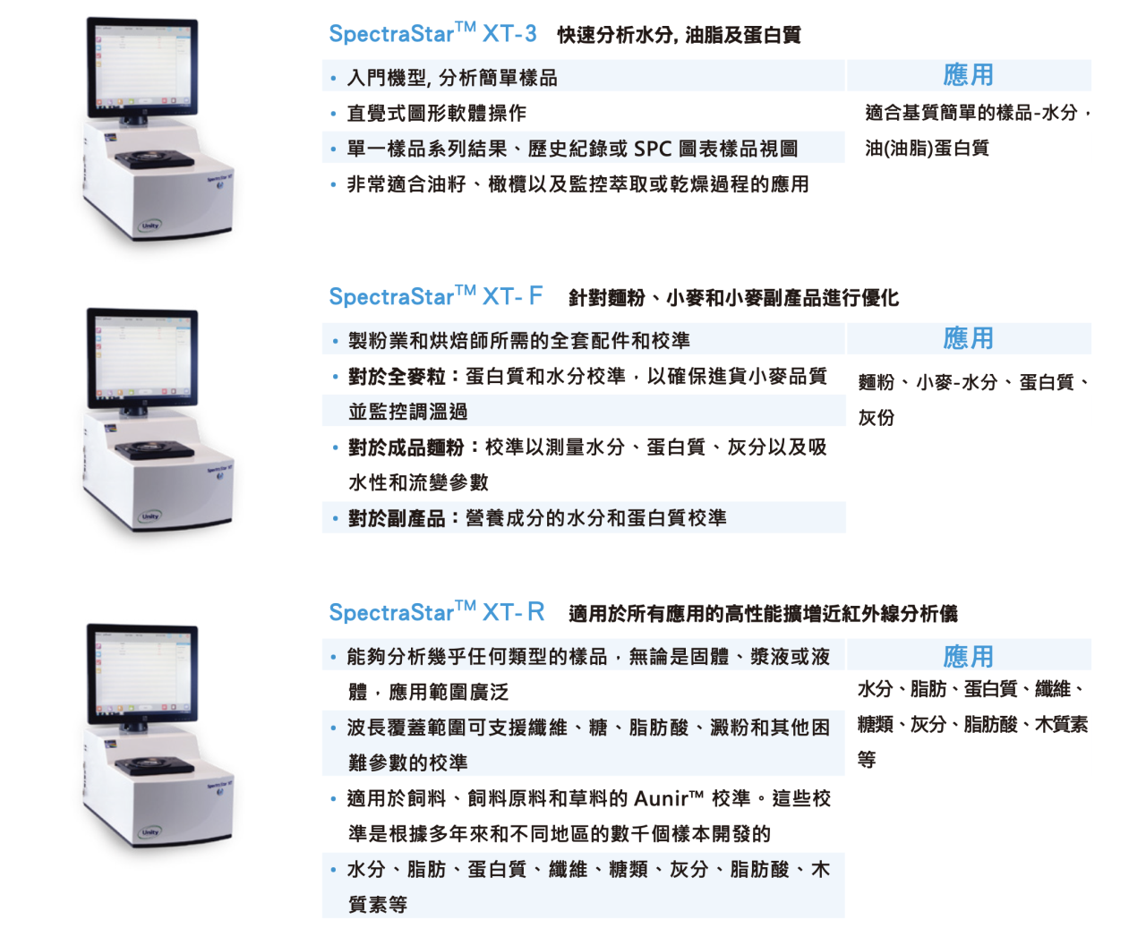 SpectraStar™ XT系列近紅外線光譜分析儀是實驗室全方位分析工具,可用於固體、粉末、飼料、種子、液體和漿料等產品的成分檢測,快速測定水分、蛋白質、脂肪、糖、纖維以及灰分、脂肪酸、木質素等複雜參數。